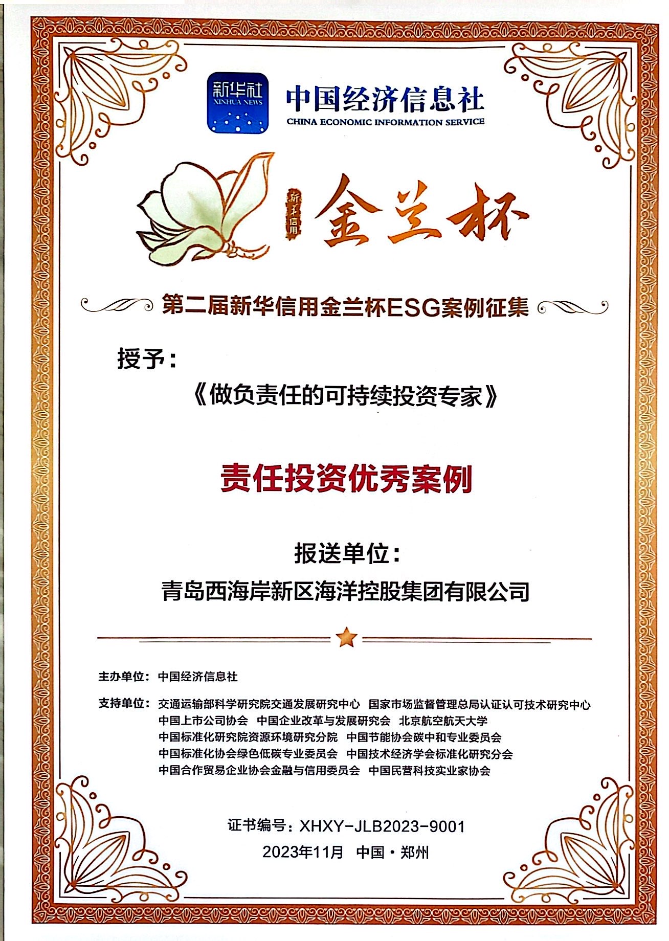11月13日,第五屆中國(guó)城市信用建設(shè)高峰論壇企業(yè)ESG與高質(zhì)量發(fā)展論壇在鄭州舉辦。活動(dòng)現(xiàn)場(chǎng),第二屆新華信用金蘭杯ESG優(yōu)秀案例名單發(fā)布。青島西海岸新區(qū)海洋控股集團(tuán)(以下簡(jiǎn)稱“??丶瘓F(tuán)”)憑借在新興產(chǎn)業(yè)培育、產(chǎn)業(yè)轉(zhuǎn)型升級(jí)、綠色投資等方面的卓越表現(xiàn),獲評(píng)“第二屆新華信用金蘭杯責(zé)任投資優(yōu)秀案例”。