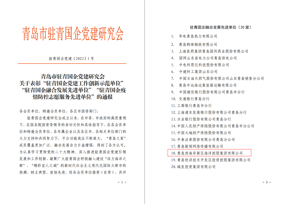 近日,青島市駐青國企黨建研究會集中表彰了一批黨建工作先進單位。海控集團榮獲“駐青國企融合發展先進單位”稱號。