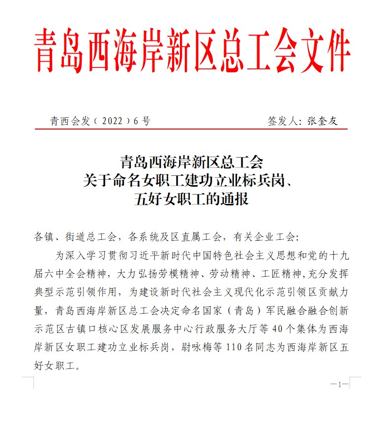 近日,青島西海岸新區女職工建功立業標兵崗名單出爐,包含40個集體,海控集團法務和風控管理崗獲評該榮譽。